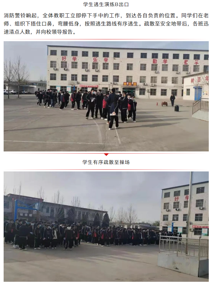 校园安全工作重于泰山。为加强全体师生自我安全保护意识,切实提升师生自纠能力,做到无论面对任何突发事件,师生能安全、迅速、有序的疏散撤离,从而确保全体师生的生命安全,我校于2022年3月26日下午开展“消防逃生应急疏散演练”活动。