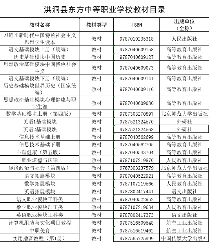 洪洞县东方中等职业学校教材目录
