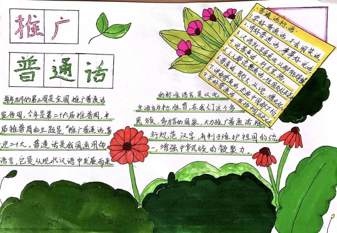 在班主任老师和科任老师的指导下,同学们积极参与到“推广普通话,奋进新征程”为主题的手抄报比赛中,巧妙设计、精心编排,绘制出了一张张图文并茂、内容丰富、活泼新颖的推普周手抄报。同学们不仅体验到了“同说普通话,共写规范汉字”的乐趣,同时语言文字综合素养也得到了促进和提高。
