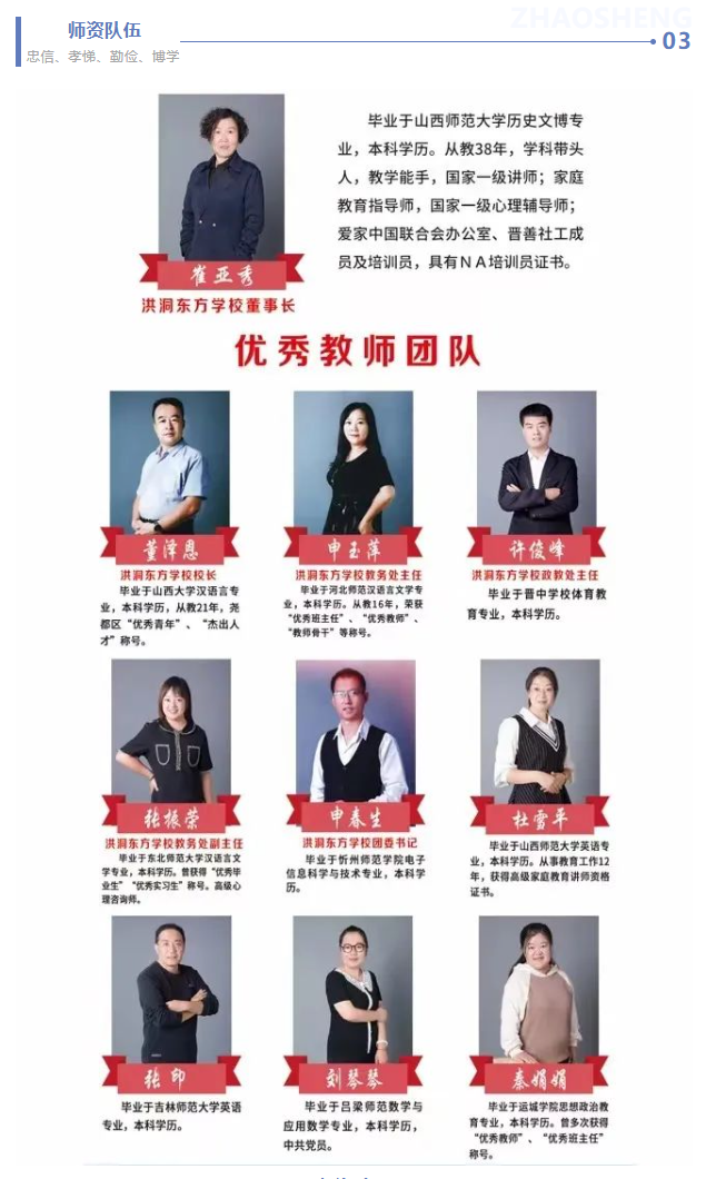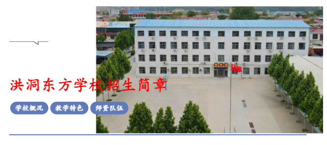 洪洞县东方学校是经山西省教育厅备案,洪洞县教育局批准的、从事中学中等教育的全日制高中学校。2019年全面启动教学,学校坚持磨砺智慧、陶冶心灵、燃烧激情、快乐新生、文化育人、精心培养