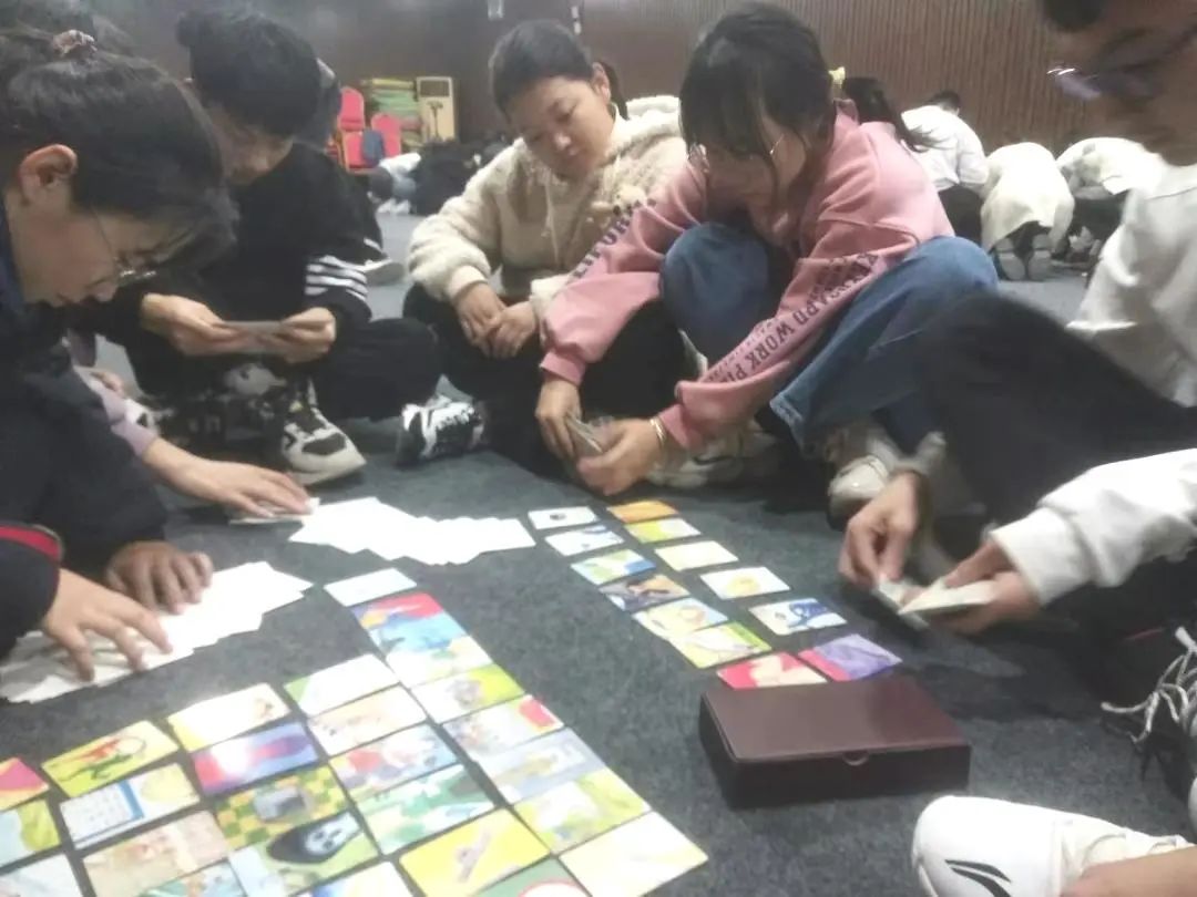 这一环节中主持人为每组准备了一套“Oh卡牌”。首先每组拿出一张“梦想”或者“希望”的纸卡,然后让学生和助教每人选择一张图卡,说出自己的图卡和字卡的关系,让学生仔细思考自己的梦想;之后让学生从图卡中选出一张图,在纸上画出自己对未来的渴望,并通过冥想畅想自己画中的未来;最后让学生选出一张代表自己“高光时刻”的图卡向同组人介绍自己的重要时刻,深刻体会自己的闪光点,加深学生对自己的了解。